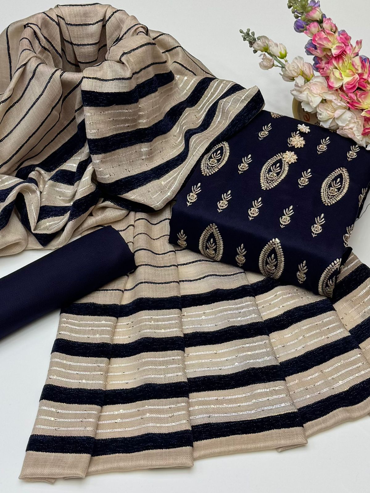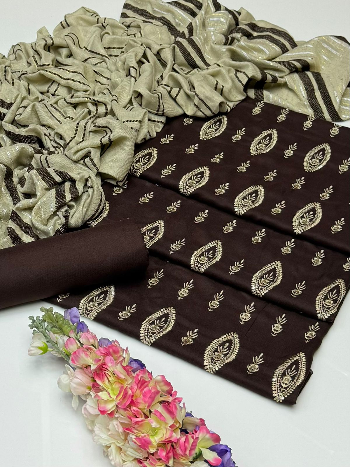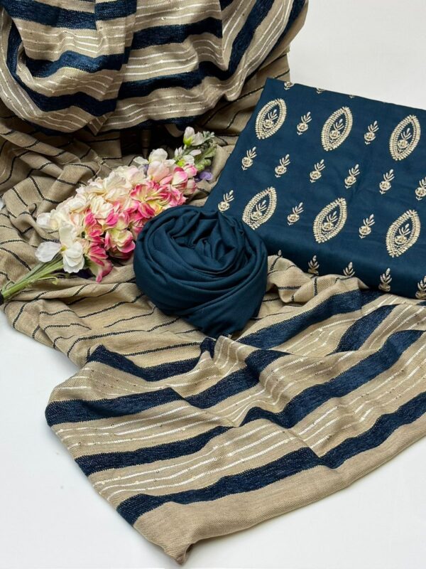 Upgrade your winter style with this beautiful and elegant Dhanak Bareeze 3-Piece Dress. The outfit features a premium embroidered thread shirt, paired with a soft plain dhanak trouser for a graceful look. Completing the set is a luxurious shawl with a velvet sequence border, adding richness and charm to your winter wardrobe.